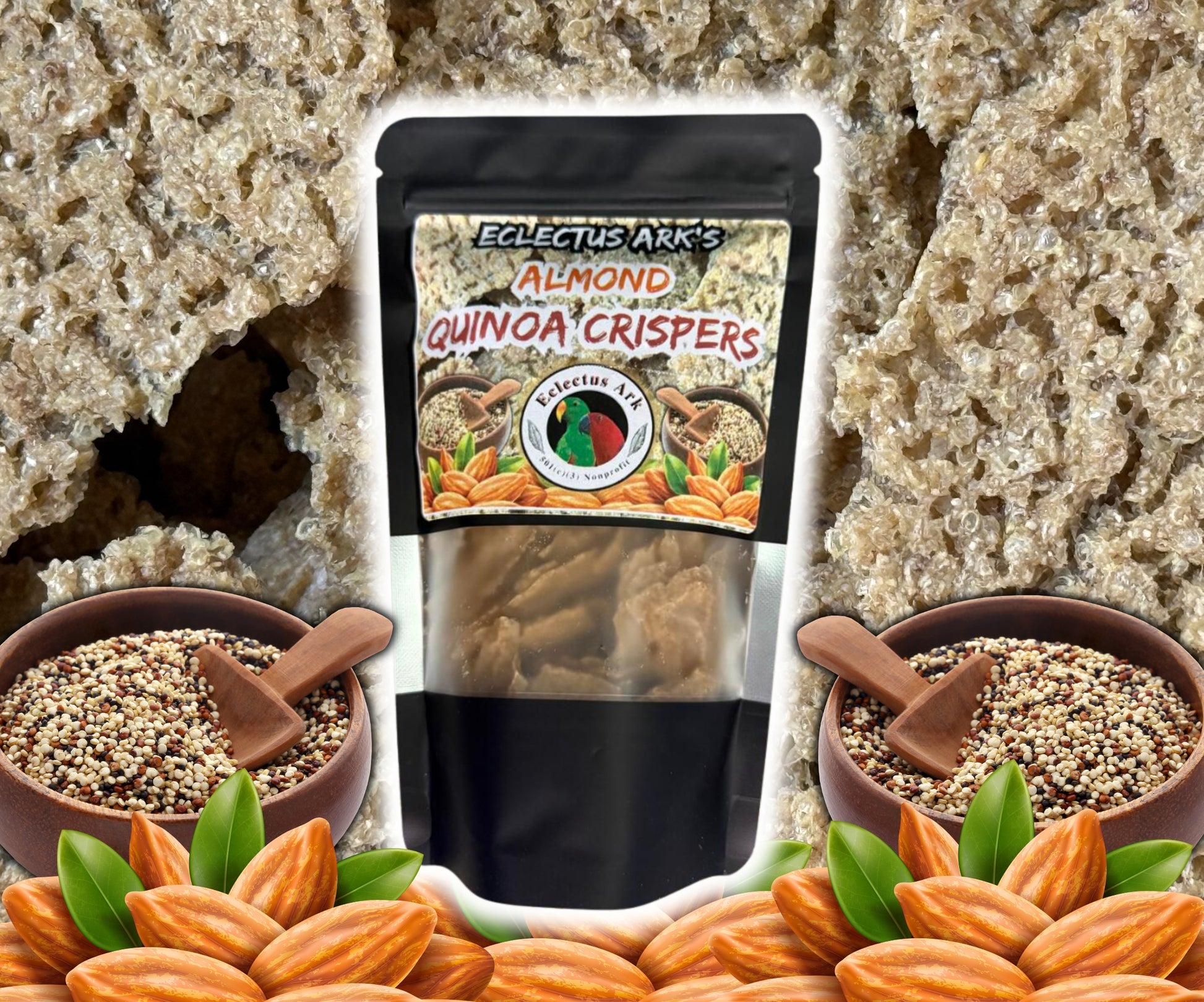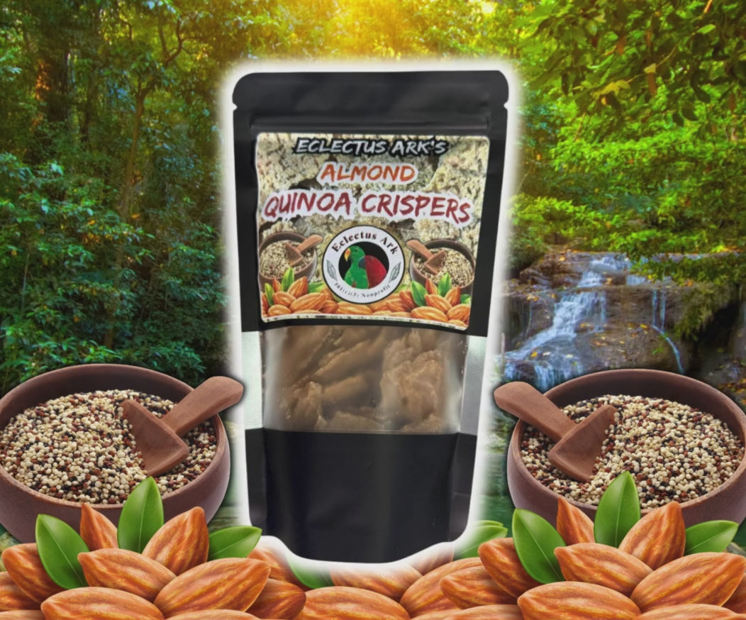 These are crunchy crisps made from cooked quinoa and home made almond flour - Great treats for all hookbills including Macaws, Cockatoos, Eclectus, African Greys, Amazons, Conures, Cockatiels, Lovebirds, Parakeets, Budgies, and more.