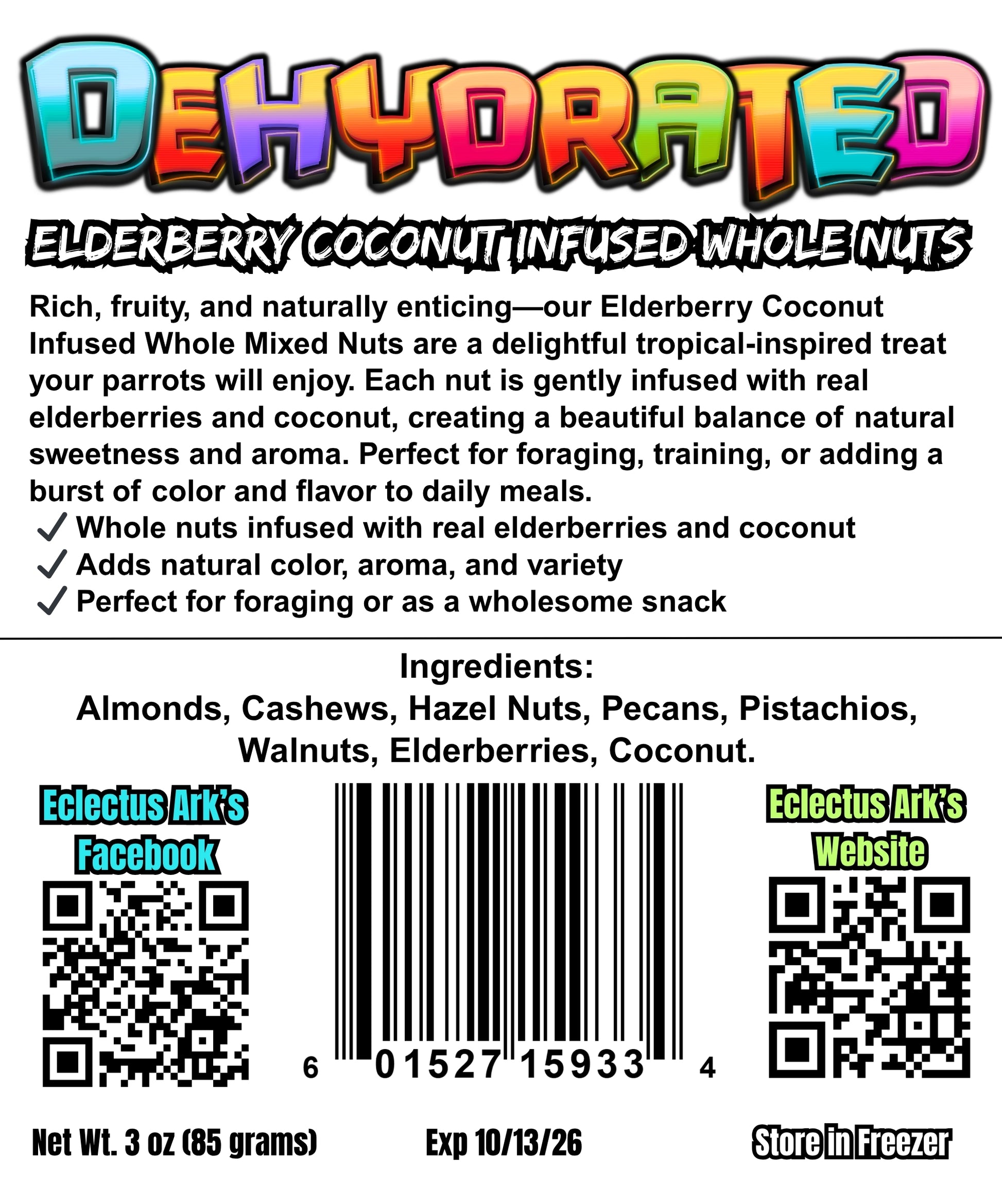 Bright, fruity, and naturally enticing — our Elderberry Coconut Infused Whole Mixed Nuts are a flavorful treat your parrots will adore. Each nut is gently infused with real elderberry and coconut, creating a naturally rich hue, subtle sweetness, and tropical aroma parrots find irresistible. This handcrafted blend provides a satisfying crunch and encourages foraging, enrichment, and natural feeding behaviors.