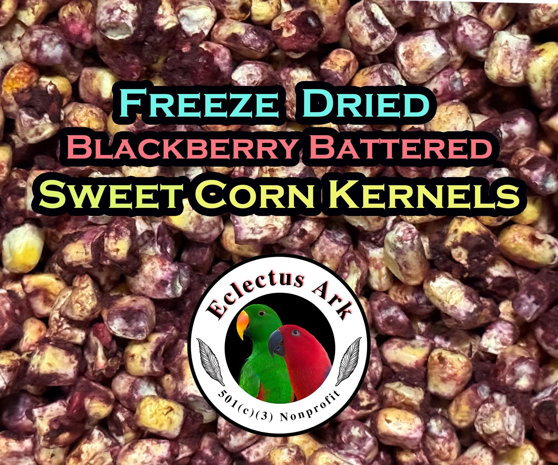 Give your bird something exciting to snack on with our Freeze-Dried Sweet Corn coated in a delicious batter made from pureed Blackberries. Freeze-dried to lock in flavor and crunch, this fun and fruity twist on corn makes for a tasty, all-natural parrot treat your feathered friend will love.