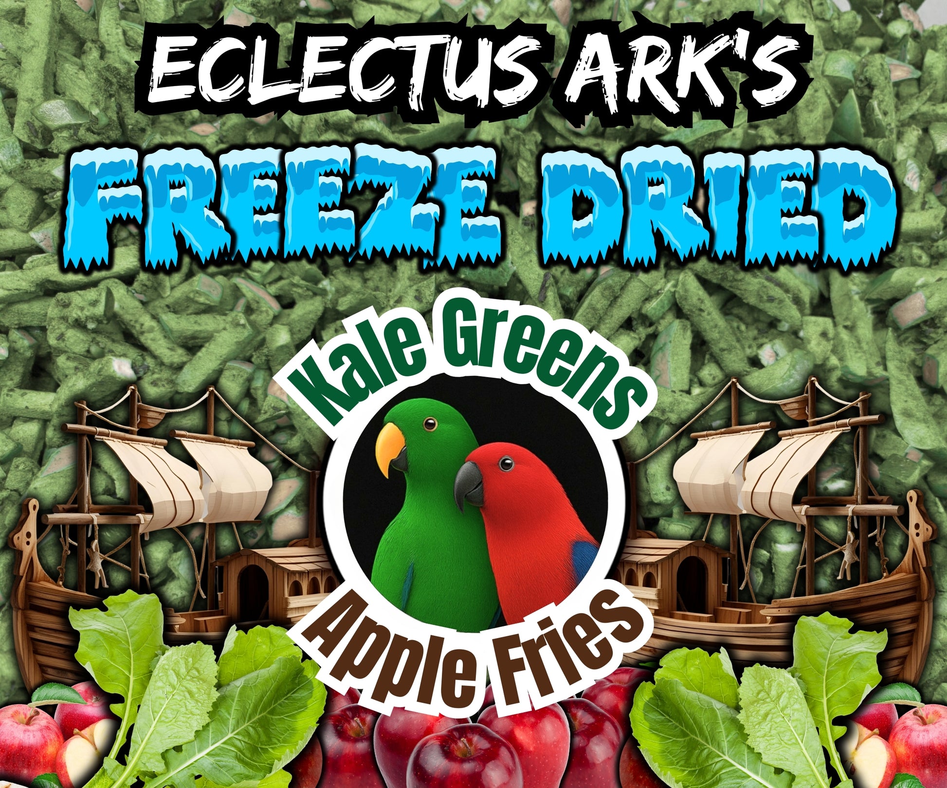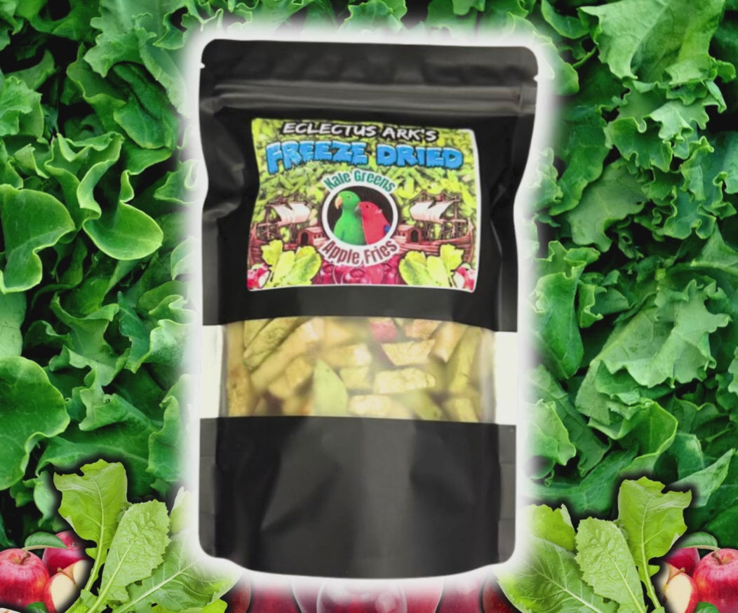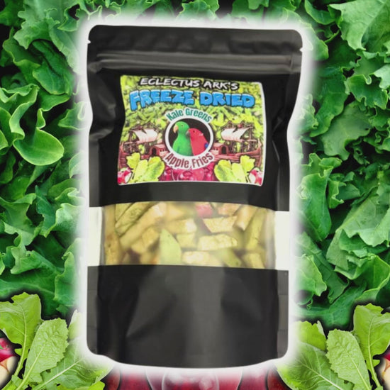 We begin with our signature apple medley—Red Delicious, Golden Delicious, Fuji, and Gala Apples—washed and sliced into fun, french fry shapes. Each fry is coated in a nutrient-rich kale greens batter before being freeze-dried to lock in crunch, color, and natural goodness. A fresh, garden-inspired twist parrots can happily crunch away on!