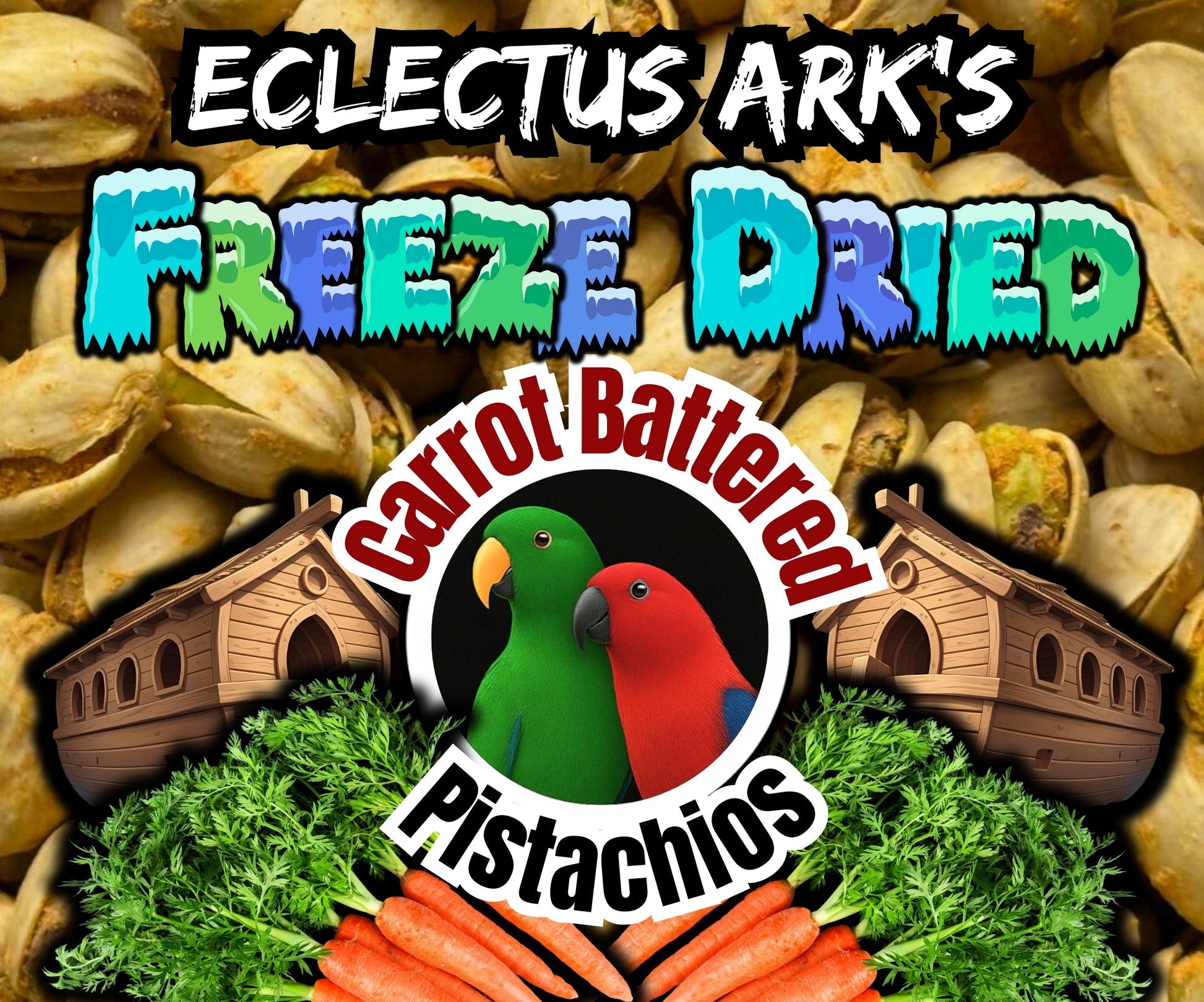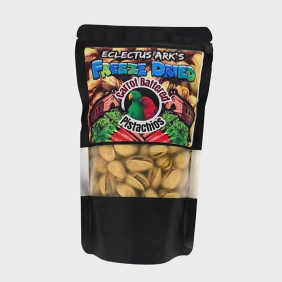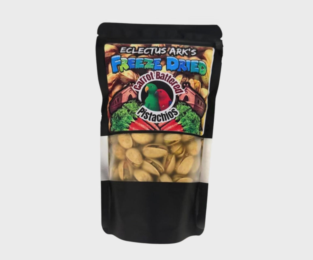 We start with premium, washed pistachios, coat them in fresh carrot puree, and freeze dry them to perfection. The result? A naturally flavorful, savory, and crunchy treat your parrot will love.