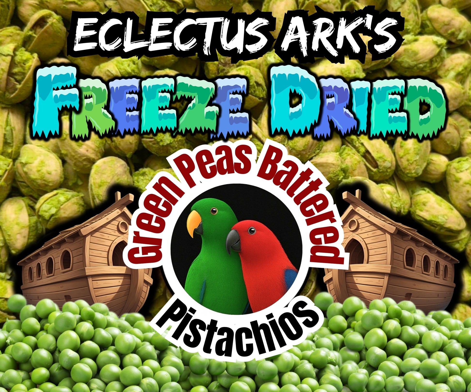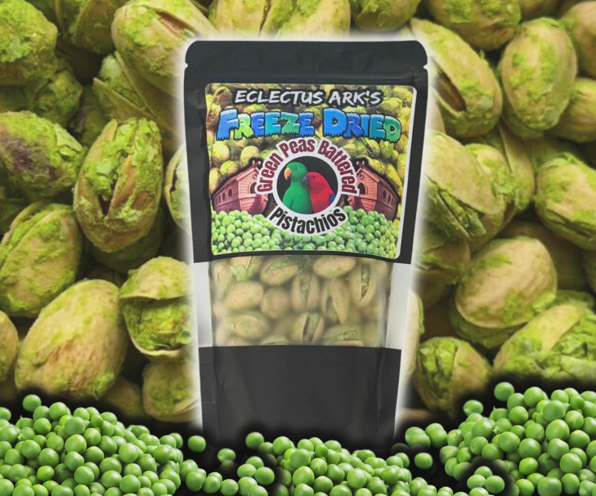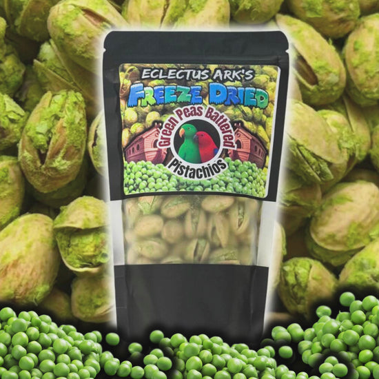 We start with premium, washed pistachios, coat them in fresh green peas puree, and freeze dry them to perfection. The result? A naturally flavorful, savory, and crunchy treat your parrot will love.