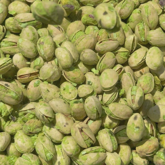 We soak and coat our premium pistachios in fresh green pea puree, then freeze dry them to capture the bright color and light, vegetable flavor. A wholesome way to add variety, fun, and texture to your parrot’s snack time.