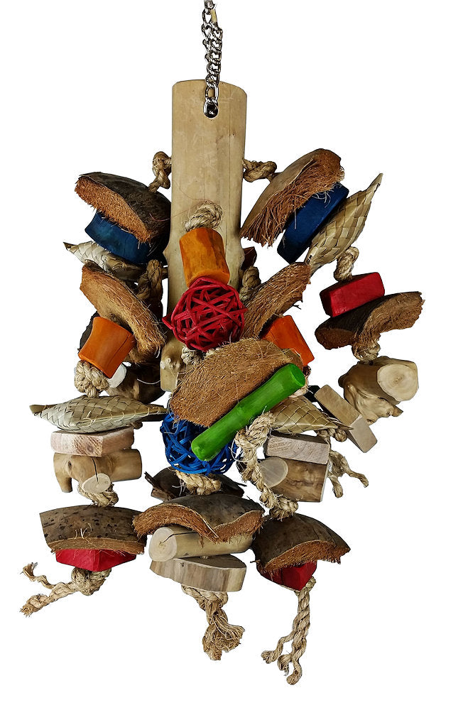 The Chunky Monsters Large Bird Toy by Happy Beaks is a powerhouse of textures, colors, and fun for large parrots. Crafted with multicolored java wood, wicker balls, sisal rope, and durable wood blocks, this toy satisfies your parrot’s need to chew, shred, and forage—all in one!