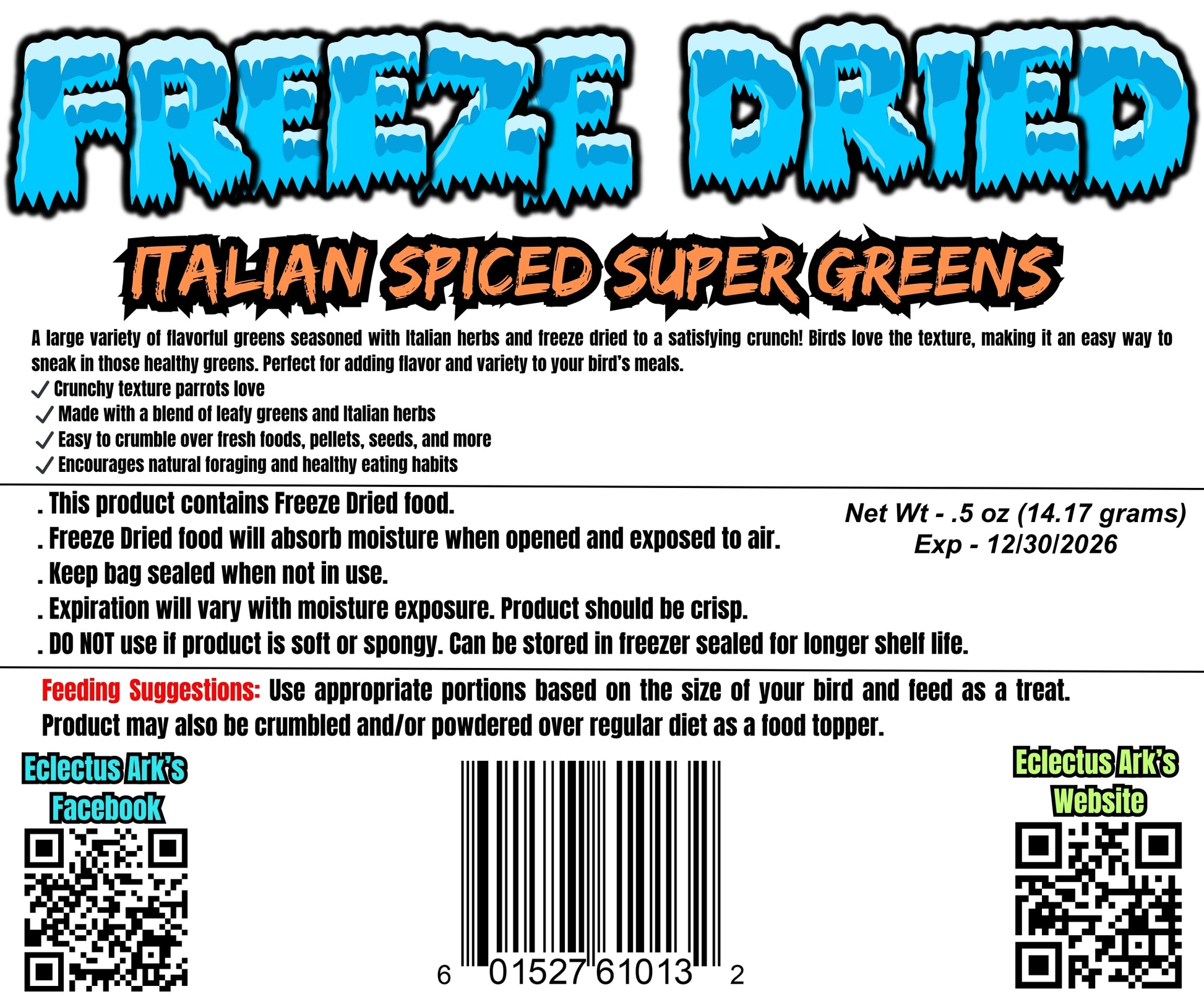 Treat your parrot to a flavor-packed, nutrient-rich greens mix with our Freeze-Dried Greens Mix - Italian Flavor! Carefully prepared with greens and Marjoram, Oregano, Thyme, Rosemary, Savory, Basil, Sage, this mix offers a variety of wholesome ingredients to support your bird’s overall health. This convenient, all-in-one treat saves you the cost and effort of buying individual greens, which would cost you over $100 at the grocery store.
