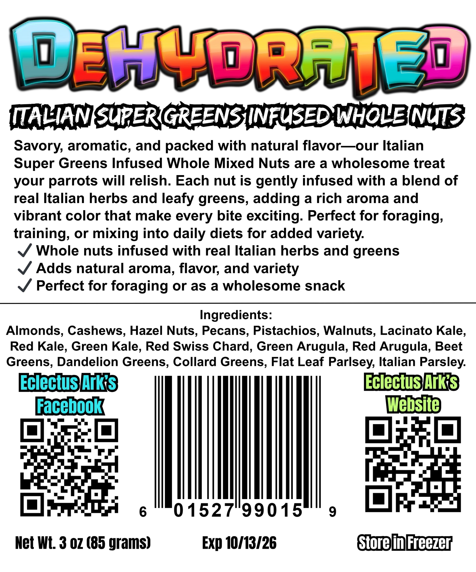 Ingredients: Almonds, Cashews, Pecans, Walnuts, Pistachios, Hazelnuts, Swiss Chard, Dandelion Greens, Lacinato Kale, Red Kale, Green Kale, Red Cabbage, Italian Seasonings (such as basil, oregano, thyme, rosemary)