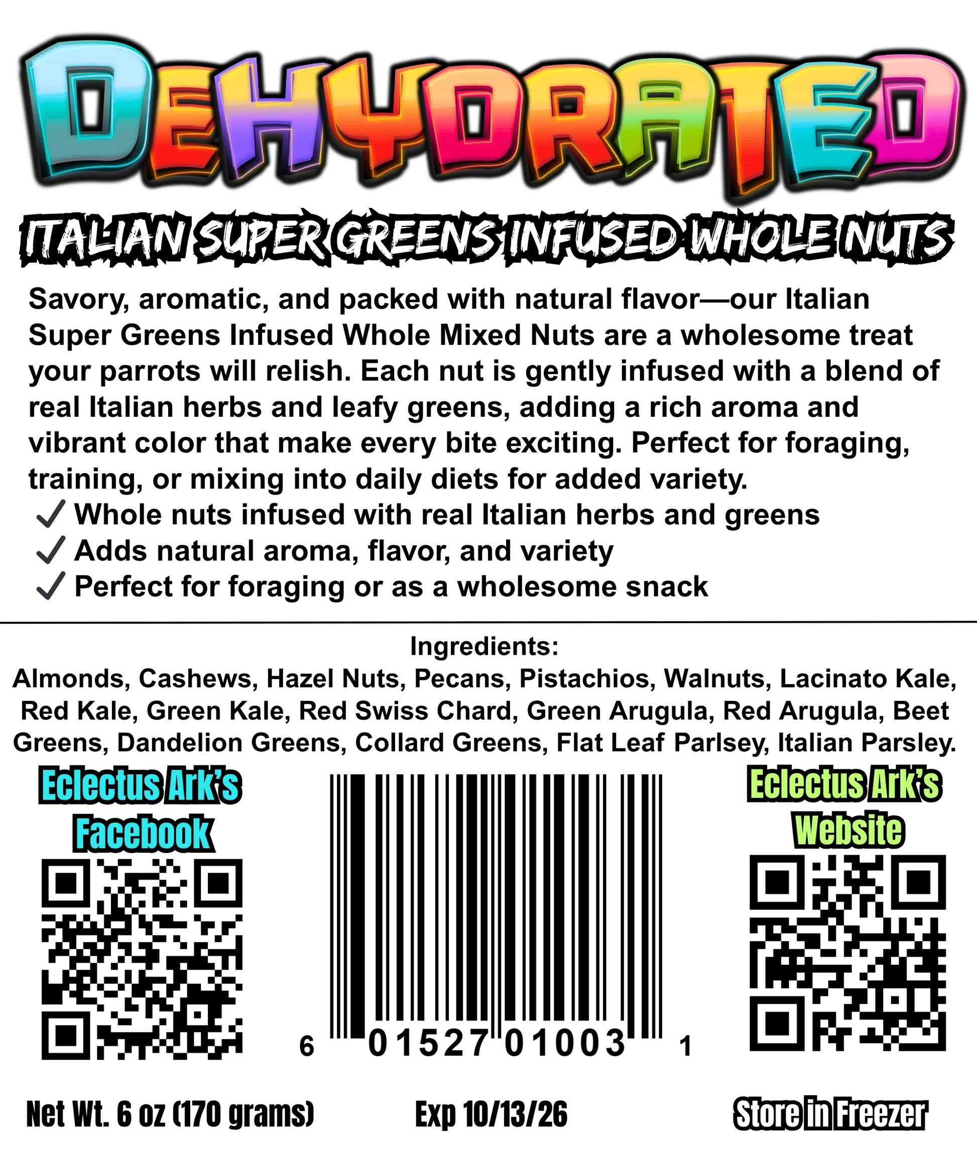 Ingredients: Almonds, Cashews, Pecans, Walnuts, Pistachios, Hazelnuts, Swiss Chard, Dandelion Greens, Lacinato Kale, Red Kale, Green Kale, Red Cabbage, Italian Seasonings (such as basil, oregano, thyme, rosemary)